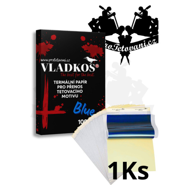 Termálny prenášací papier VLADKOS Blue je kompatibilný so všetkými termálnymi tlačiarňami na prenos tetovacích motívov. Skladá sa z troch vrstiev a je navrhnutý na presný a čistý prenos dizajnu na koži.